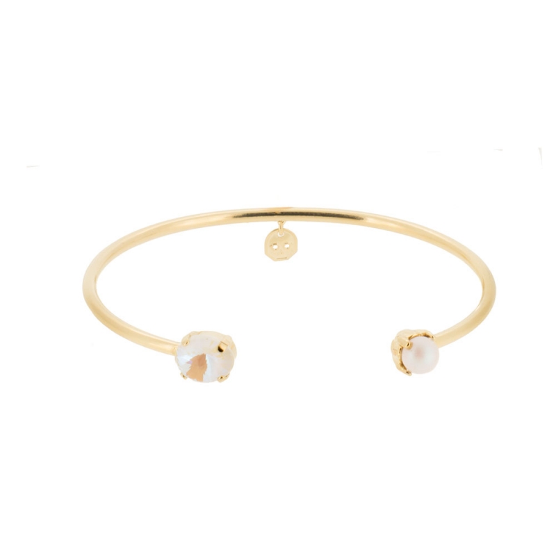 Brazalete chapado en oro amarillo y montado con cristal y perla de Swarovski® en gama de blancos.